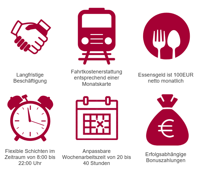 • Die Schichten werden einen Monat im Voraus vereinbart und liegen im Zeitraum von 8:00 bis 22:00 Uhr
