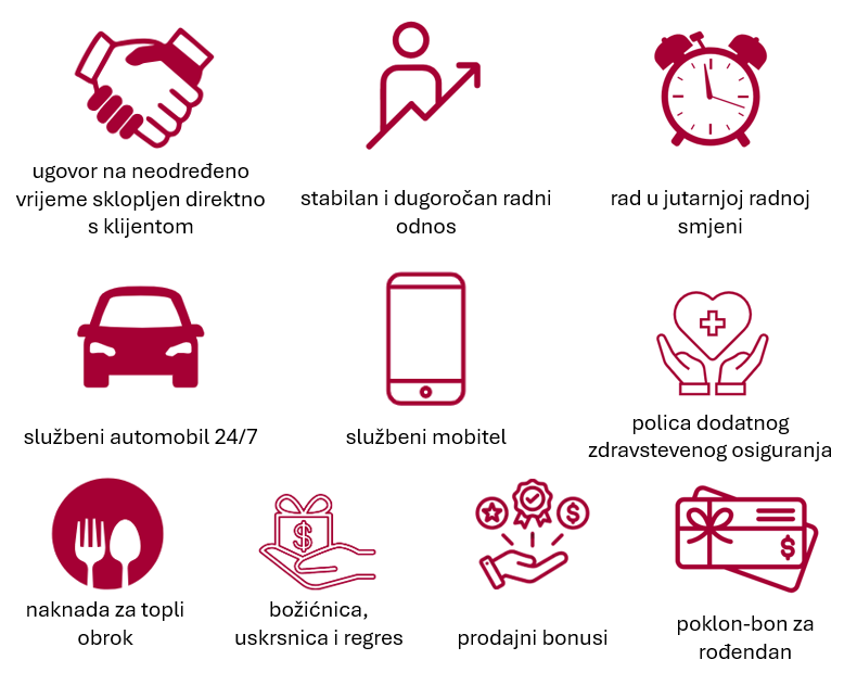 Kandidati sa prebivalištem u Zagrebu ili okolici tri dana tjedno radili bi teren u Sloveniji, a dva dana u uredu u Zagrebu. Organizacija rada na terenu može biti fleksibilna — kandidat može noćiti u Sloveniji ili se svakodnevno vraćati u Zagreb, ovisno o planu i rasporedu sastanaka.