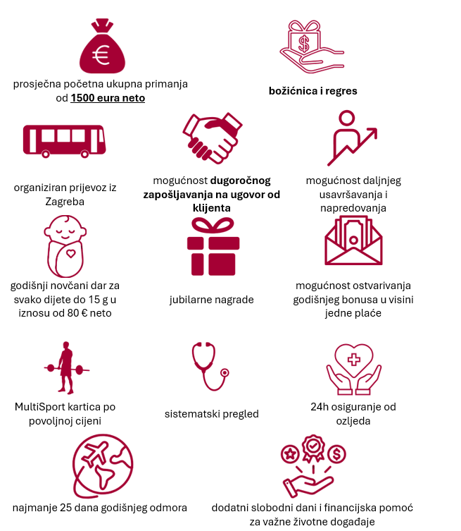 Radno vrijeme uključuje smjenski rad u jutarnjoj, poslijepodnevnoj i noćnoj smjeni, kao i rad vikendima. Ne brini, ukoliko radiš vikend, ovisno o rasporedu biti ćeš slobodan neke druge dane u tjednu.