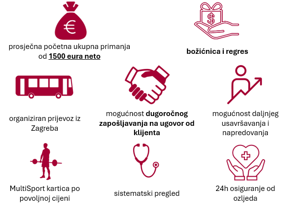 Radno vrijeme uključuje smjenski rad u jutarnjoj, poslijepodnevnoj i noćnoj smjeni, kao i rad vikendima. Ne brini, ukoliko radiš vikend, ovisno o rasporedu biti ćeš slobodan neke druge dane u tjednu.