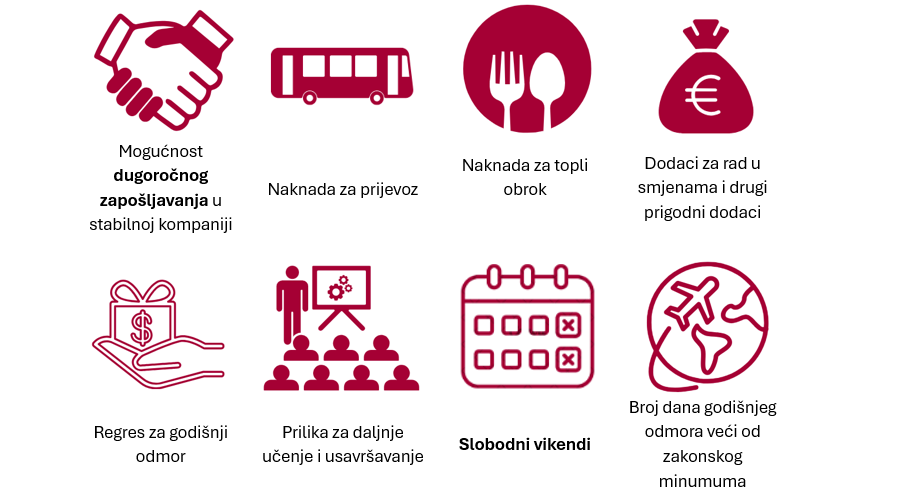 • Spremnost na rad u jutarnjoj, popodnevnoj i noćnoj smjeni sa slobodnim vikendima!
