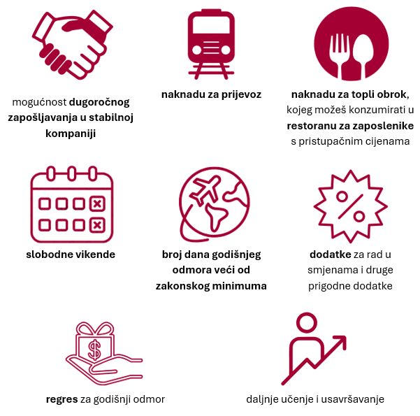 • spremnost na rad u jutarnjoj i popodnevnoj smjeni sa slobodnim vikendima