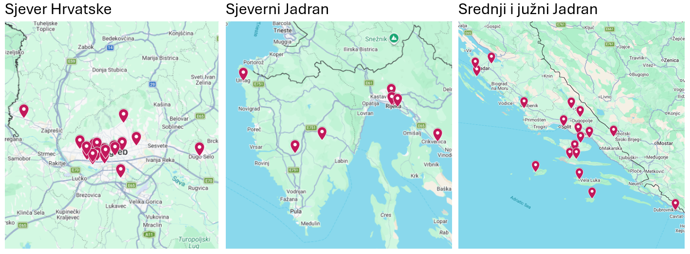 Lokacije: Zagreb, Rijeka, Spit, Zadar, Šibenik, Omiš, Dubrovnik, Bolč, Brač, Crikvenica, Donji Laduč, Dubrovnik, Dugo Selo, Gračišće, Islam Grčki, Kanfanar, Komiža, Kukljica, Lastovo, Nemira, Pisak, Pučišća Kirigin, Radošić, Sobra, Stari Grad, Trilj, Umag, Vela Luka, Vrboska, Zmijavci